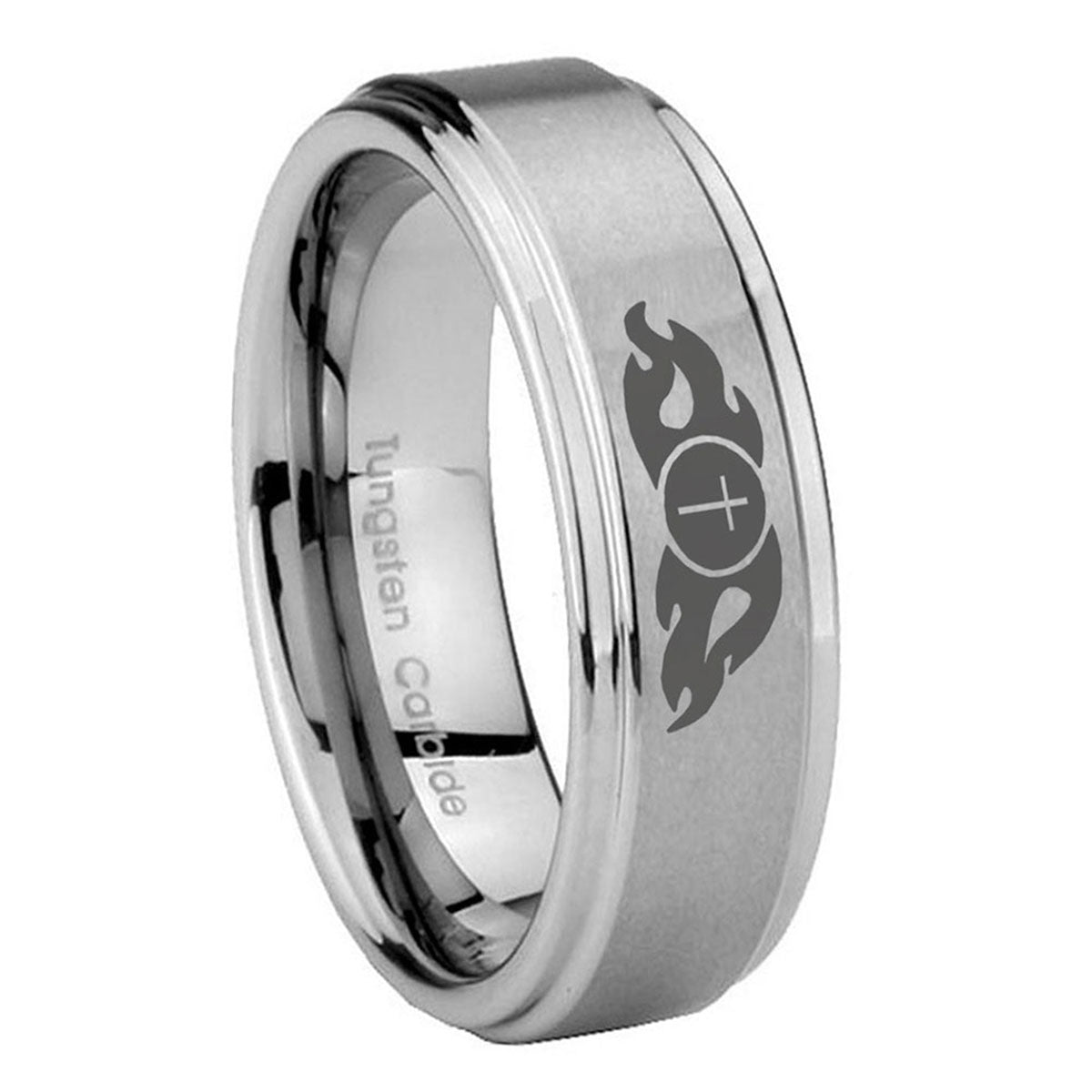 Celebrate with the 10mm Flamed Cross Step Edges Brushed Tungsten Carbide Wedding Band Ring. This brushed tungsten ring with Flamed Cross design and step edges is perfect for weddings.