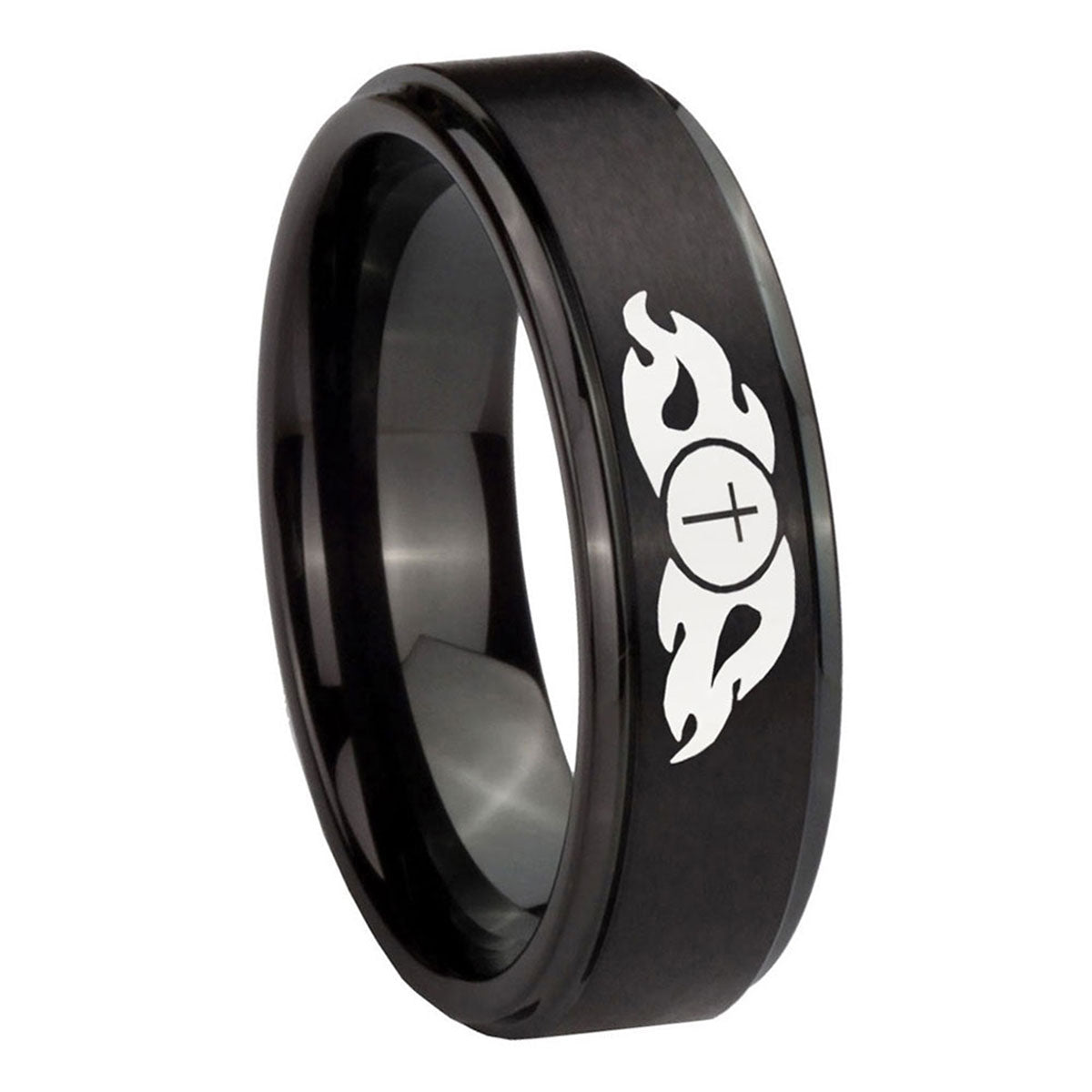 Style the 10mm Flamed Cross Step Edges Brush Black Tungsten Carbide Bands Ring. This brushed black ring with step edges and Flamed Cross design is perfect for men.
