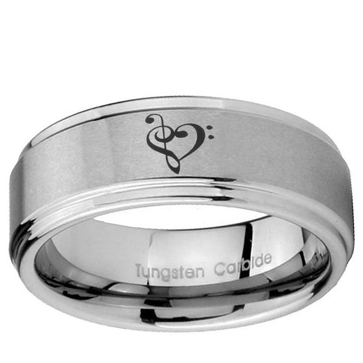 Intruding 5, 8mm Music & Heart Step Edges Brushed Silver Tungsten Carbide Men's Bands Ring . Offer in both 5mm and 8mm band width brushed grey finished from size 4 to 14
