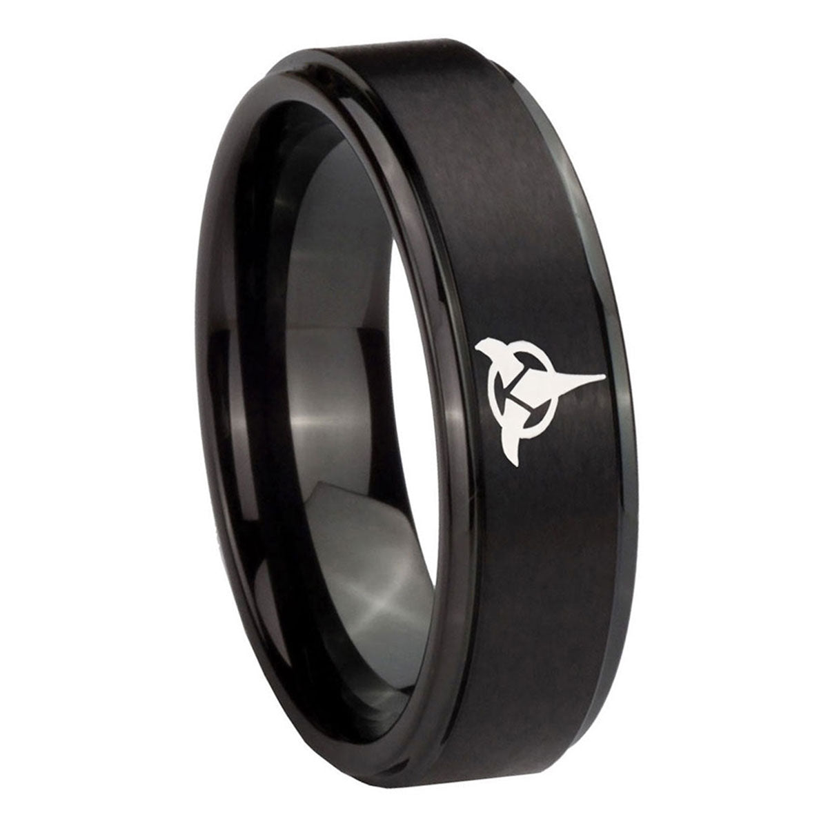 Propose with the 10mm Klingon Step Edges Brush Black Tungsten Carbide Men's Engagement Ring. This brushed black ring with step edges and Klingon design is ideal for engagements.