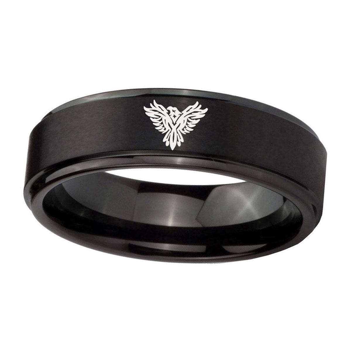 Make a promise with the 10mm Phoenix Step Edges Brush Black Tungsten Carbide Promise Ring. This brushed black ring with step edges and Phoenix design is ideal for commitments.