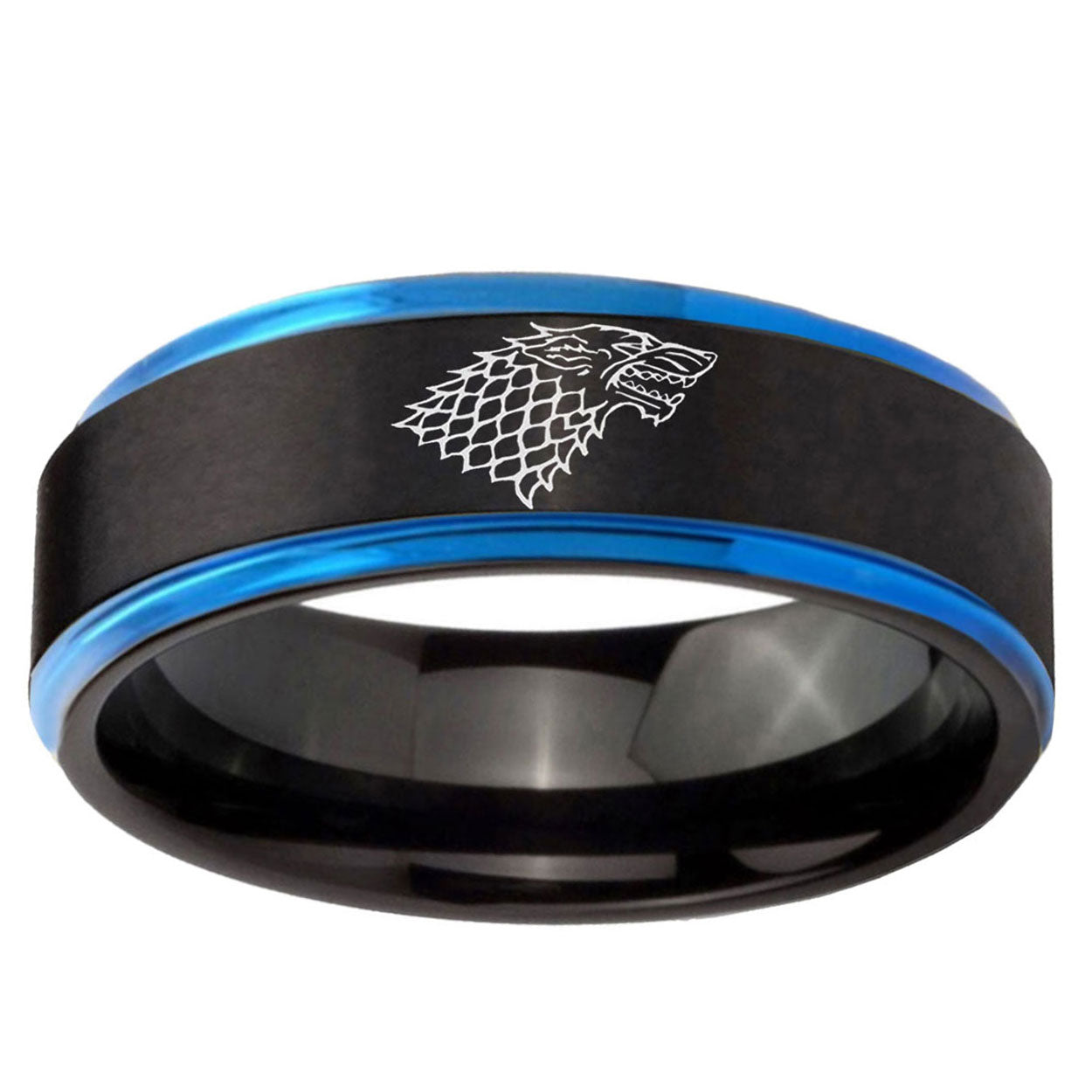 10mm Game Of Thrones House Stark Direwolf Blue Step Edges Brushed Tungsten Carbide Mens Promise Ring