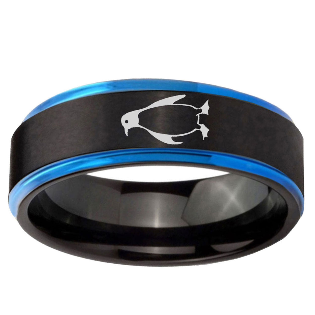 Make a promise with the 10mm Penguin Blue Step Edges Brushed Tungsten Carbide Mens Promise Ring. This brushed blue tungsten ring with Penguin design is ideal for commitments.