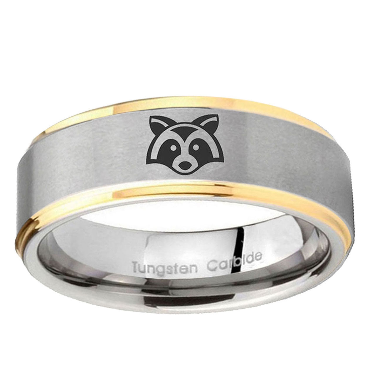 Style the 10mm Raccoon Animal Step Edges Gold 2 Tone Tungsten Carbide Bands Ring. This gold and 2-tone tungsten ring with Raccoon Animal design is perfect for men.