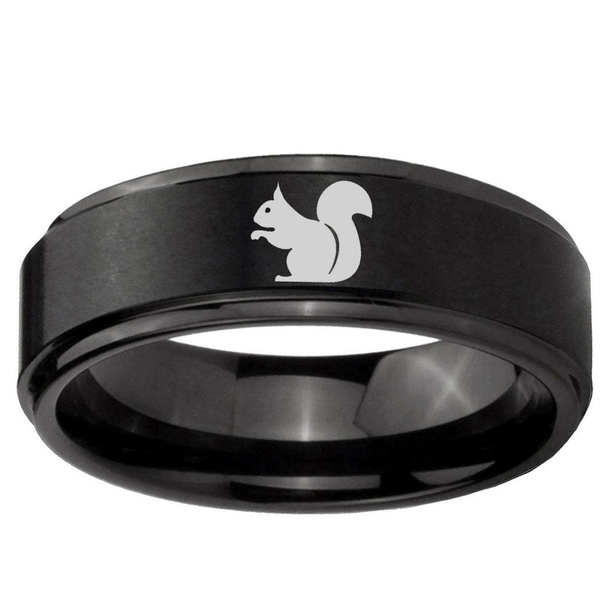 Make a promise with the 10mm Squirrel Step Edges Brush Black Tungsten Men's Promise Rings. This brushed black ring with step edges and Squirrel design is ideal for commitments.