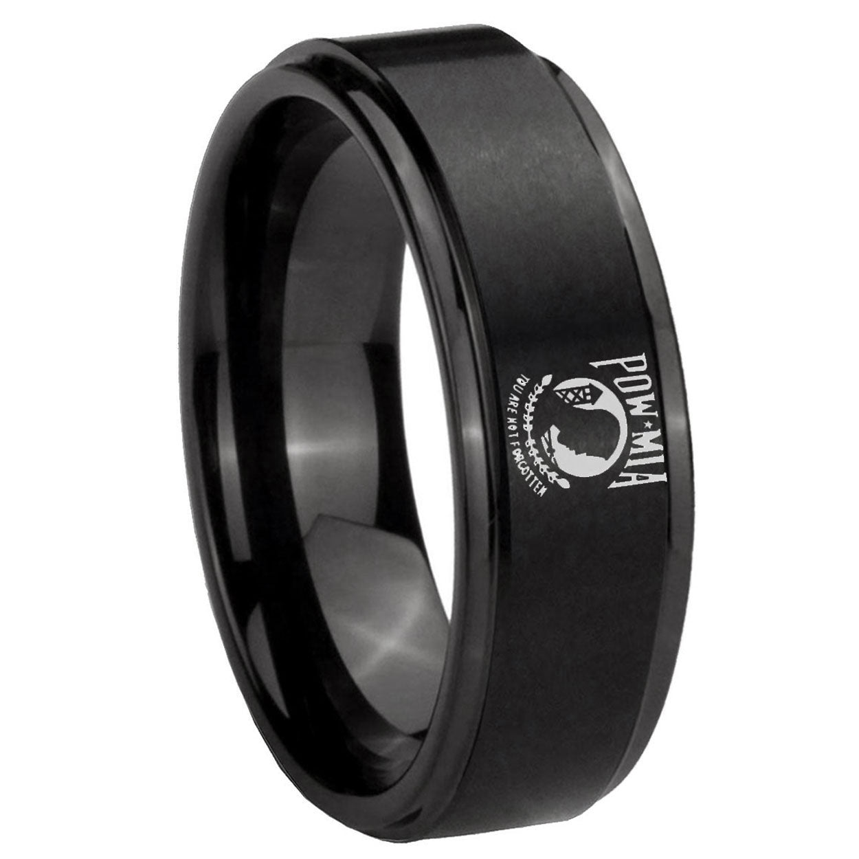Intruding 5, 8mm Military Pow Step Edges Brush Black Tungsten Carbide Men's Wedding Ring . Offer in both 5mm and 8mm band width brush black plated finished from size 4 to 14