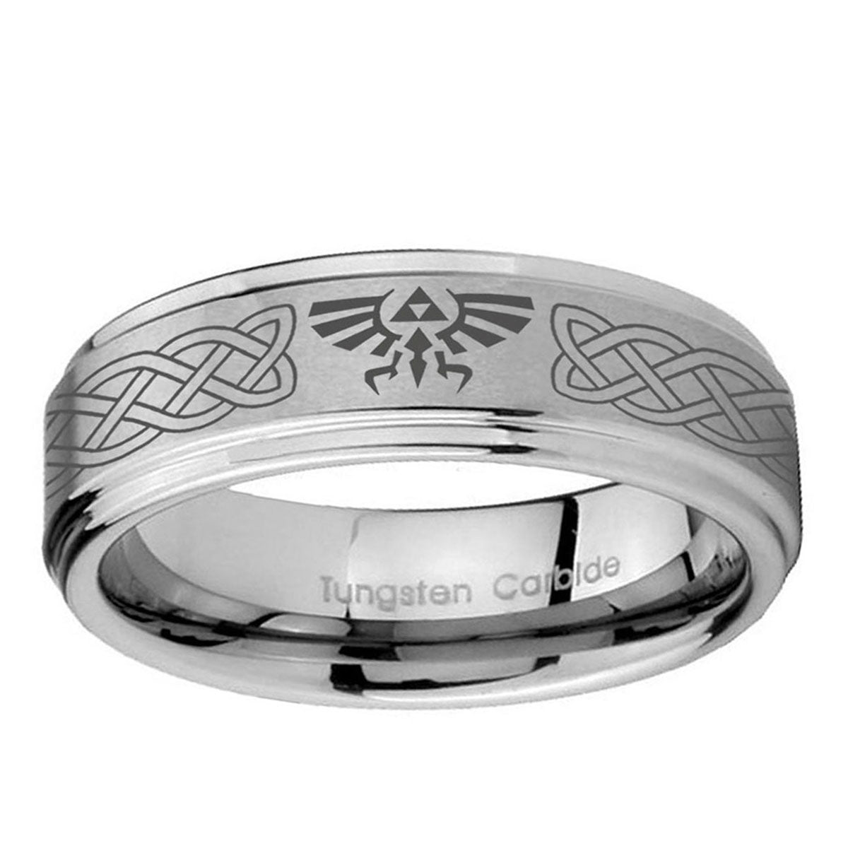 Propose with the 10mm Celtic Zelda Step Edges Brushed Tungsten Carbide Men's Engagement Ring. This brushed tungsten ring with Celtic Zelda design and step edges is ideal for engagements.