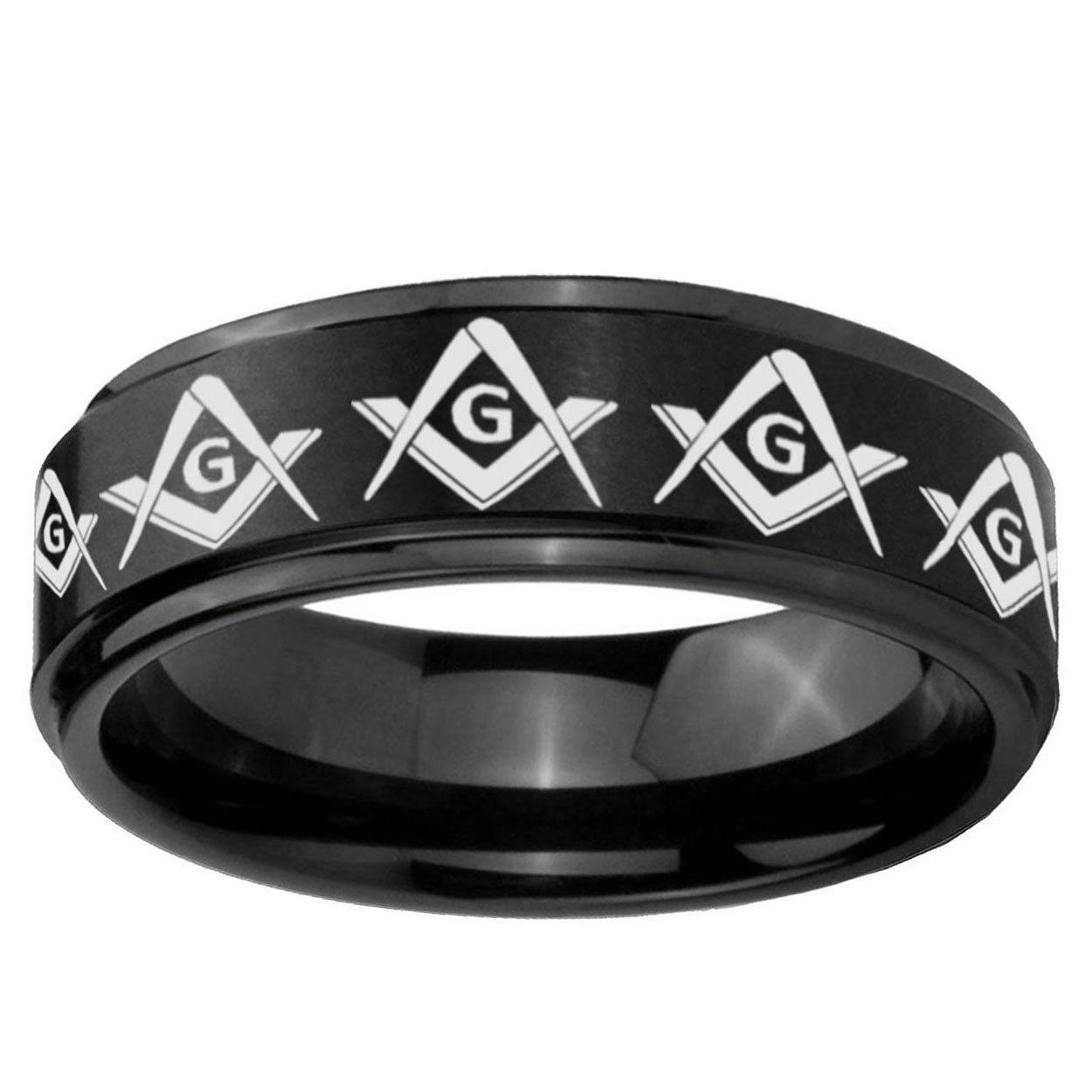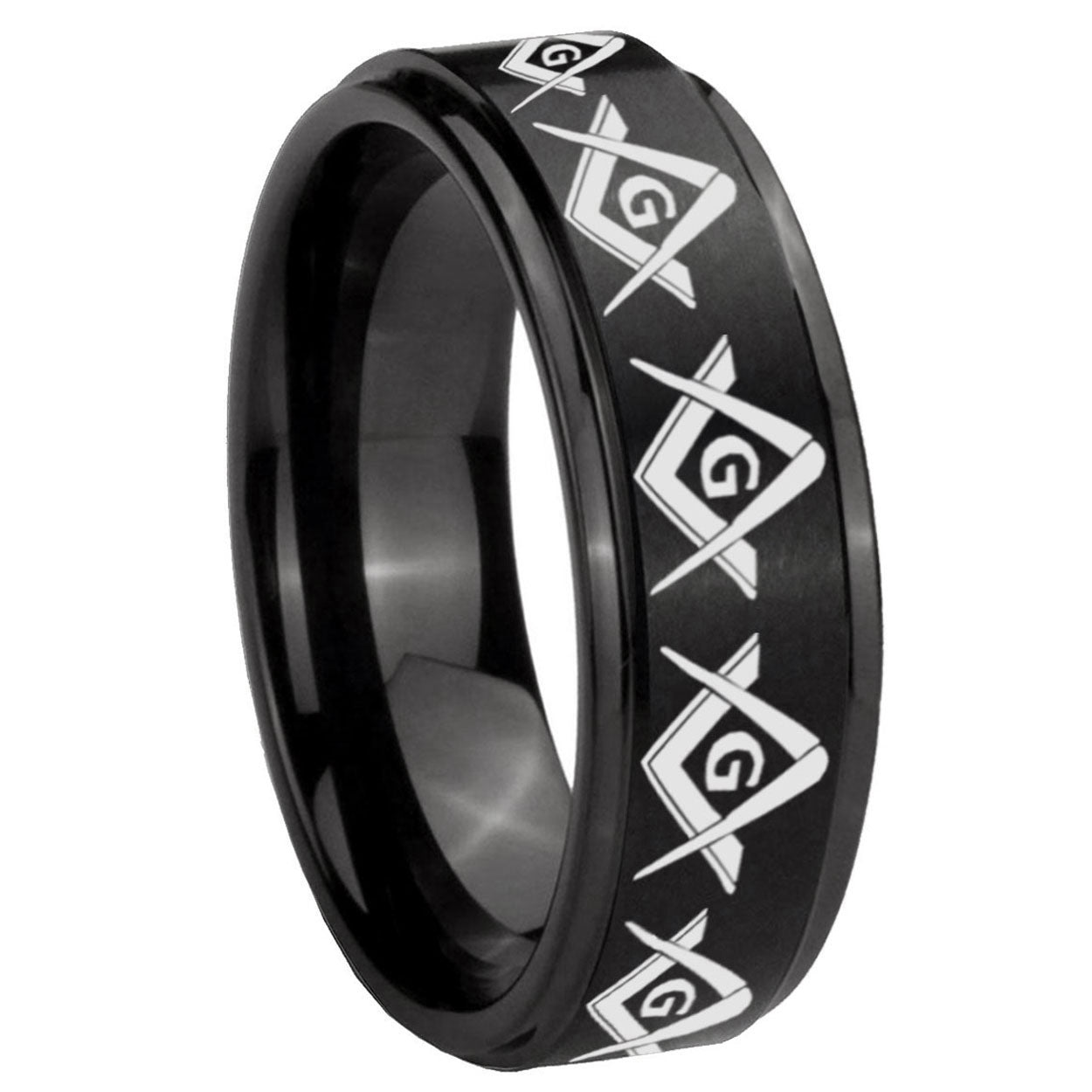 10mm Masonic Square and Compass Step Edges Brush Black Tungsten Men's Promise Rings