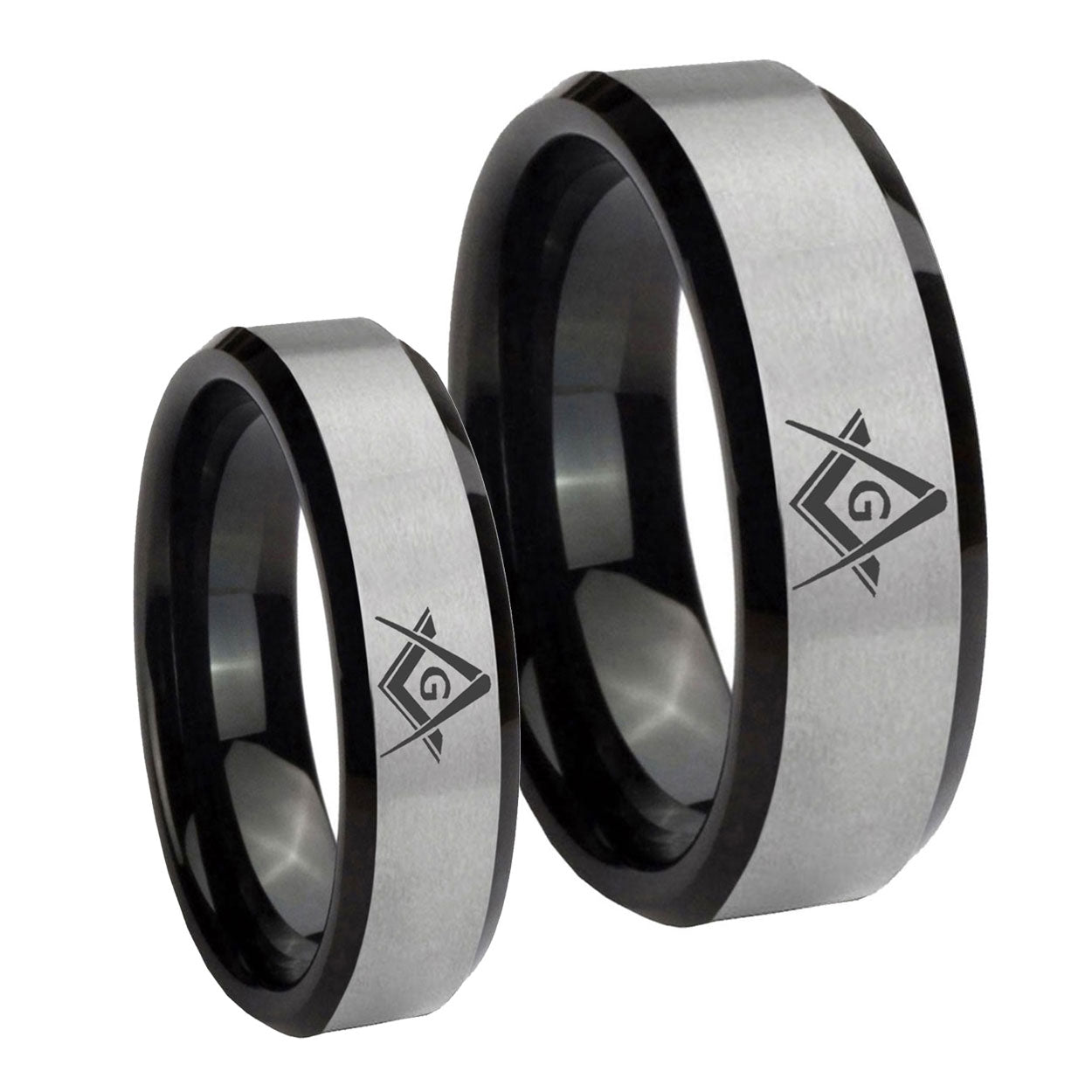 His Hers Freemason Masonic Beveled Brush Black 2 Tone Tungsten Ring Set