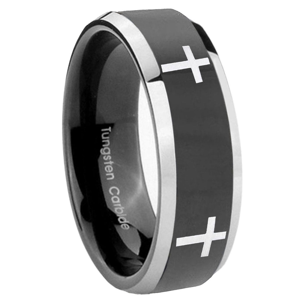 Buy the His And Hers Crosses Beveled Edges Glossy Black 2 Tone Tungsten Anniversary Ring. Sleek and modern.