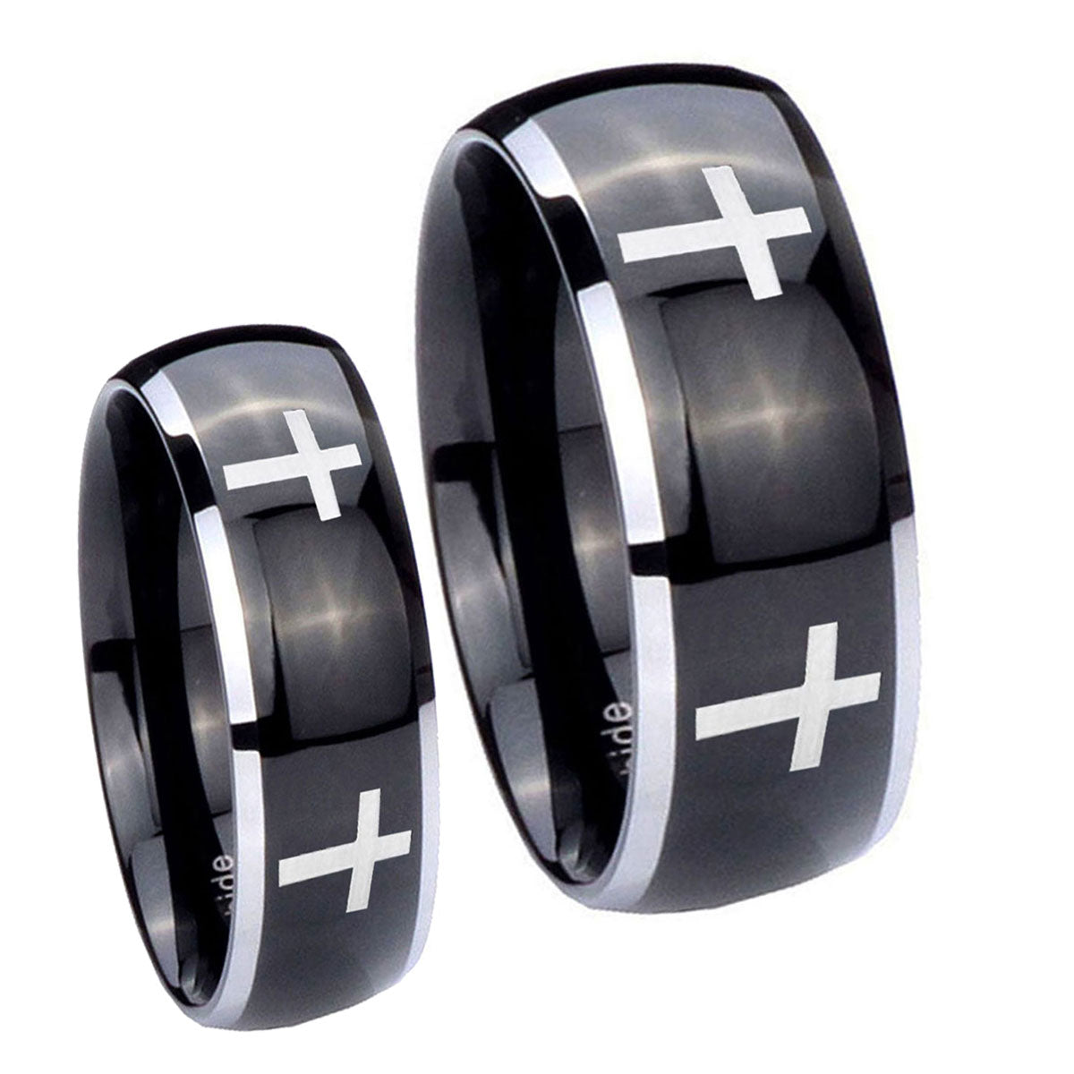His and Hers Crosses Dome Glossy Black 2 Tone Tungsten Mens Promise Ring Set
