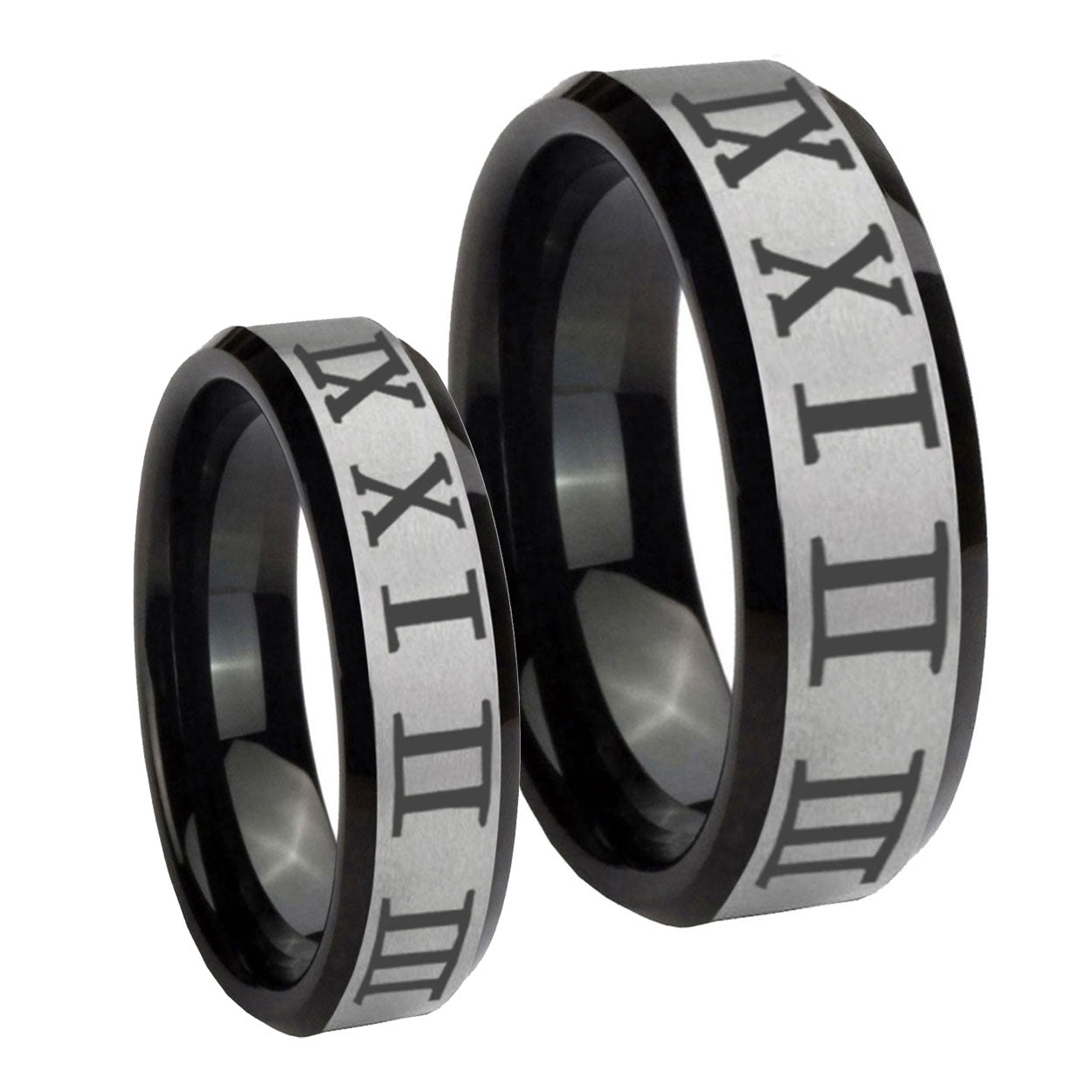His Hers Roman Numeral Beveled Brush Black 2 Tone Tungsten Mens Wedding Ring Set