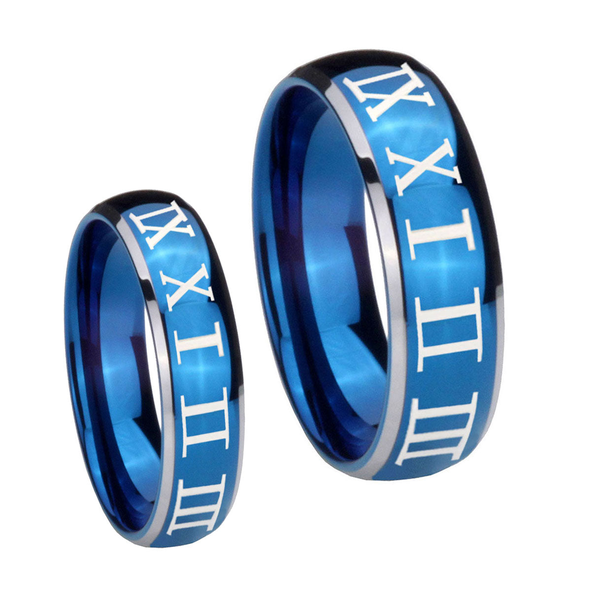 His Hers Roman Numeral Dome Blue 2 Tone Tungsten Mens Anniversary Ring Set