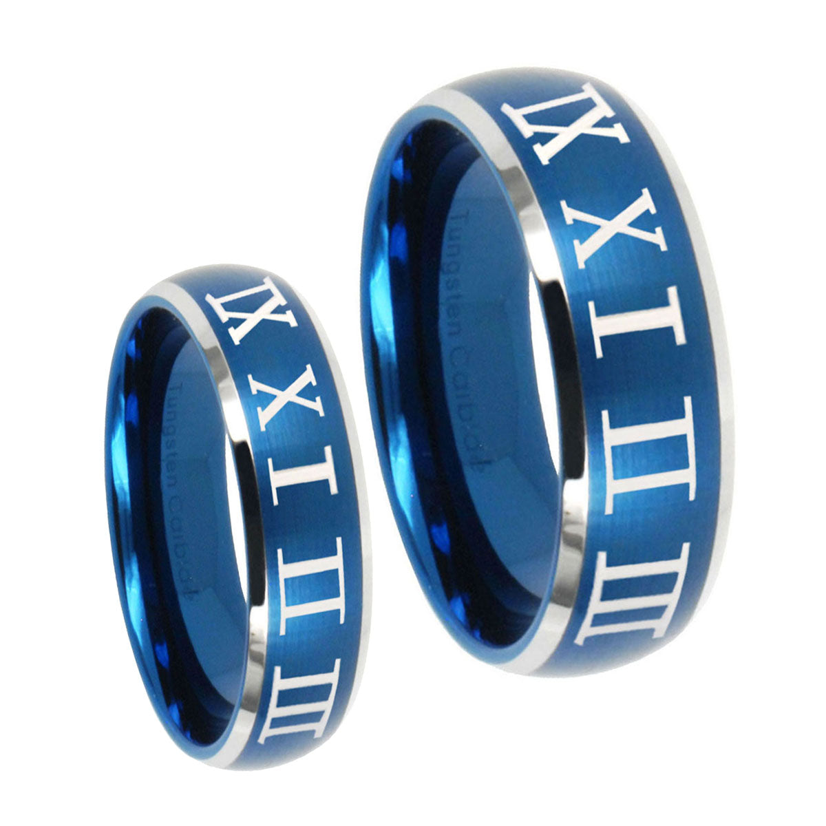 His Hers Roman Numeral Dome Brushed Blue 2 Tone Tungsten Men's Ring Set