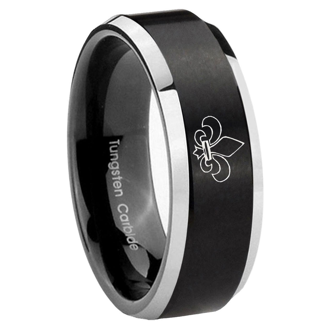 Buy the His And Hers Fleur De Lis Beveled Brush Black 2 Tone Tungsten Wedding Engraving Ring. Sleek design.