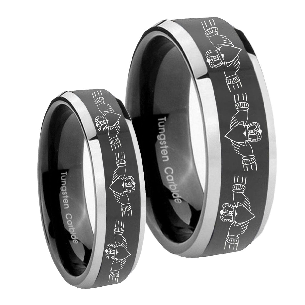 His Hers Irish Claddagh Beveled Glossy Black 2 Tone Tungsten Rings Set