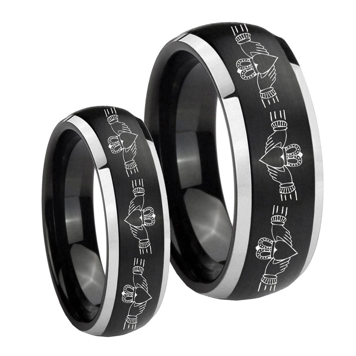 His Hers Irish Claddagh Dome Brushed Black 2 Tone Tungsten Wedding Band Ring Set
