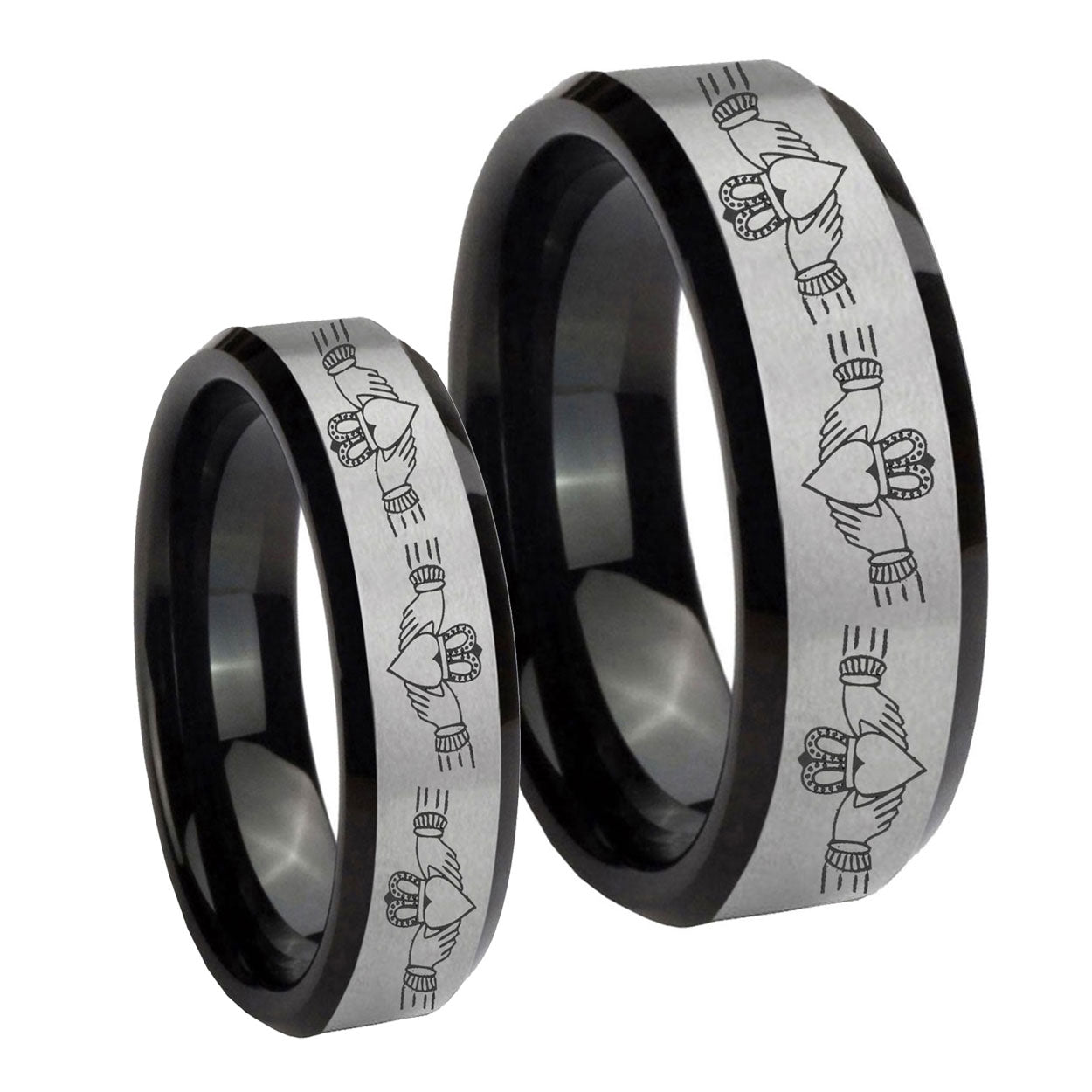 His Hers Irish Claddagh Beveled Brush Black 2 Tone Tungsten Men's Band Ring Set