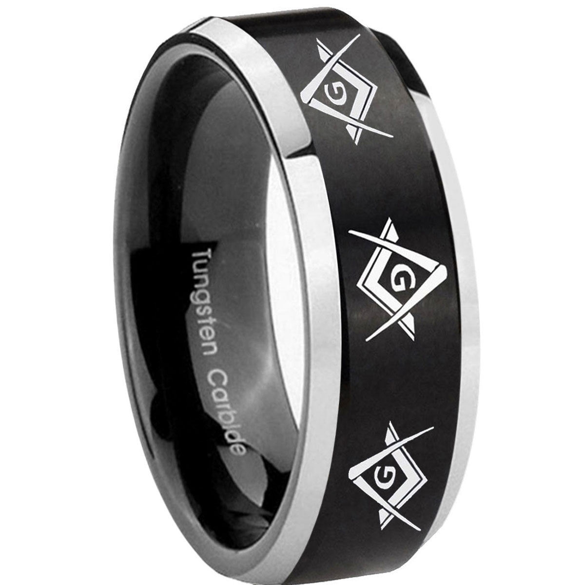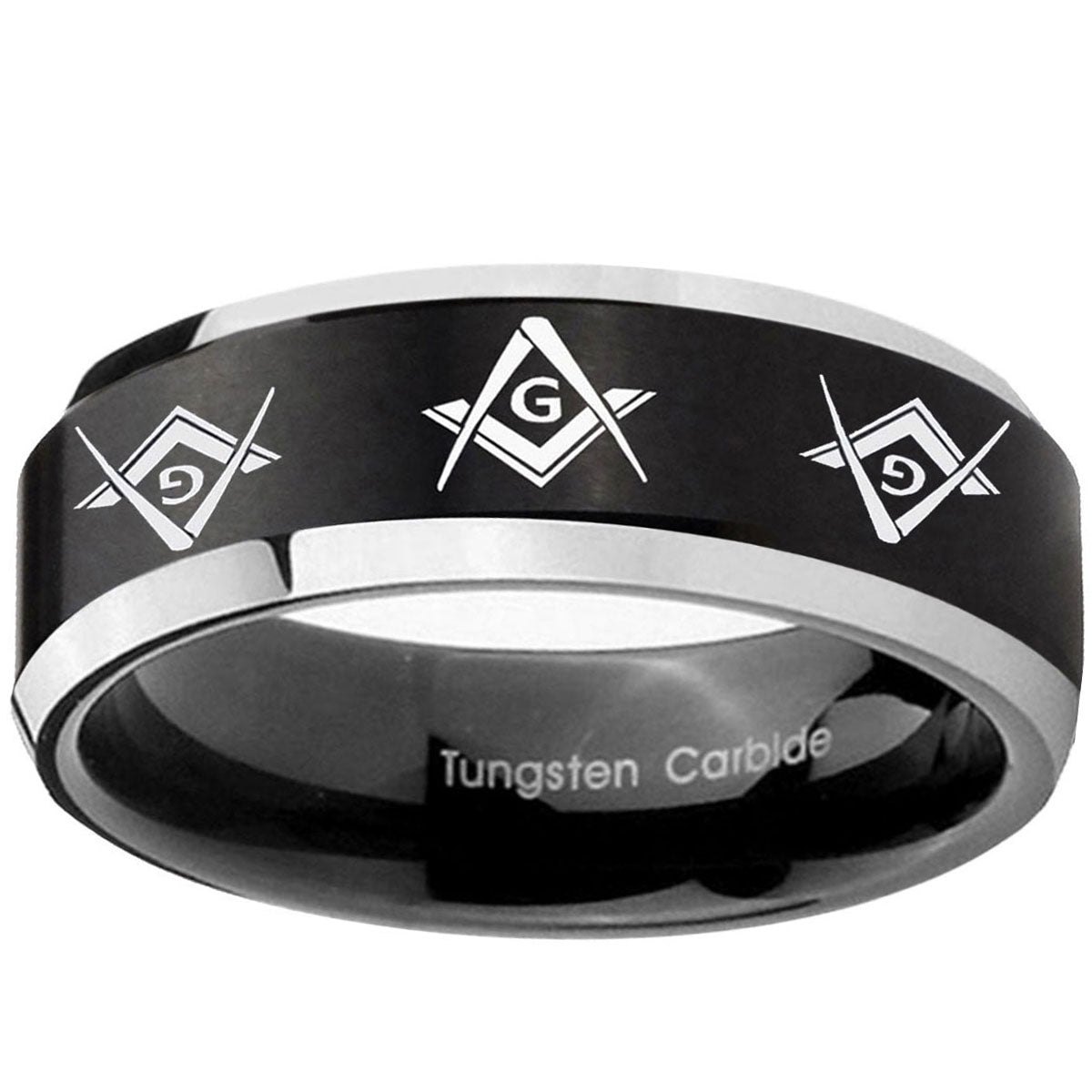 10mm Master Mason Masonic Beveled Brush Black 2 Tone Tungsten Mens Wedding Band