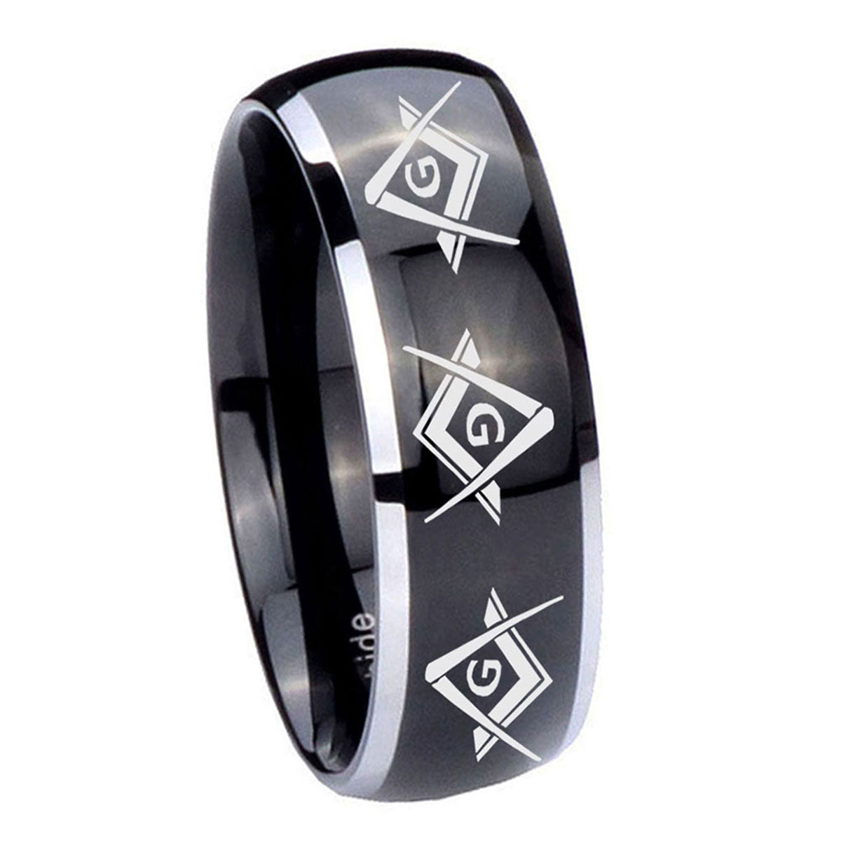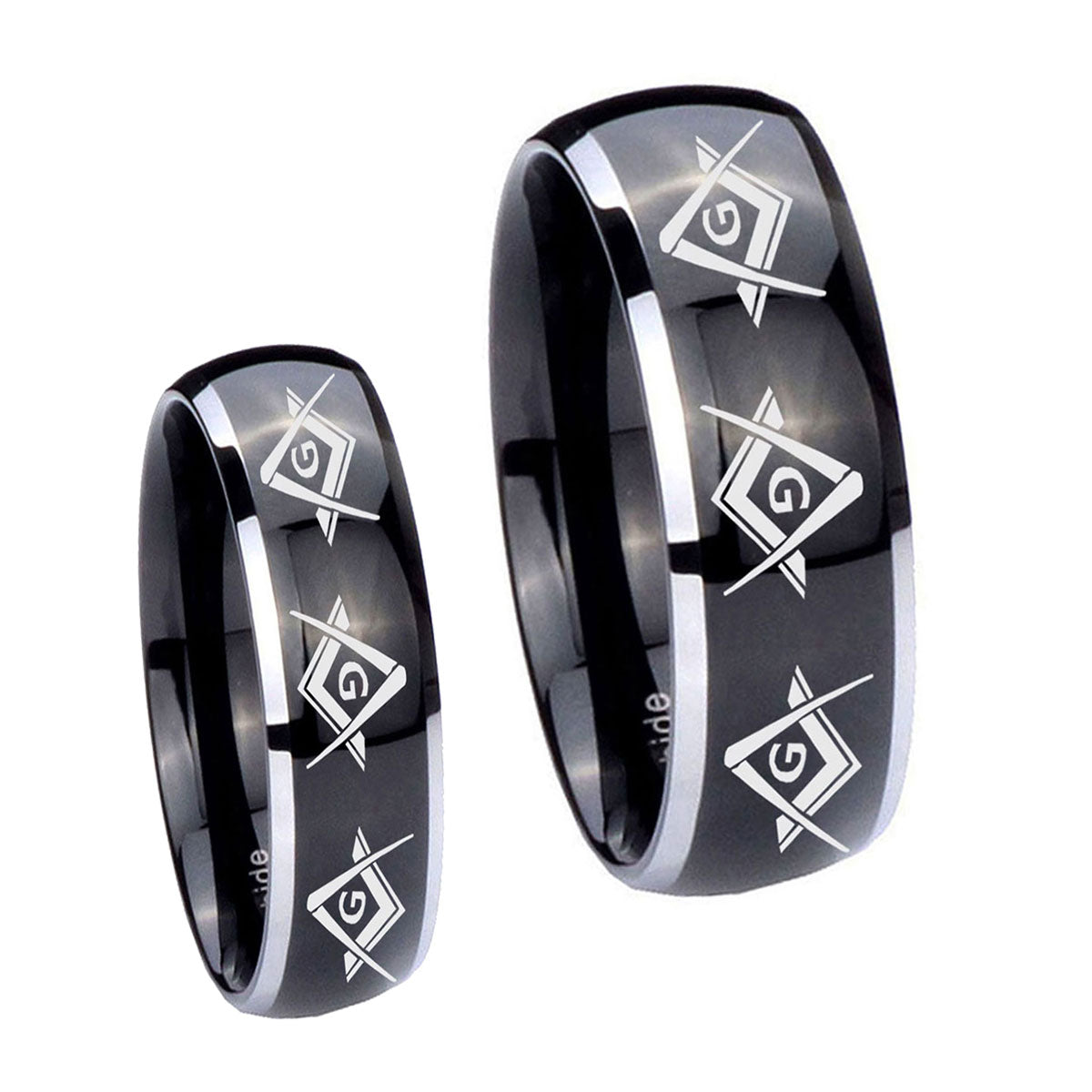 His Hers Master Mason Masonic Dome Glossy Black 2 Tone Tungsten Engraving Ring Set