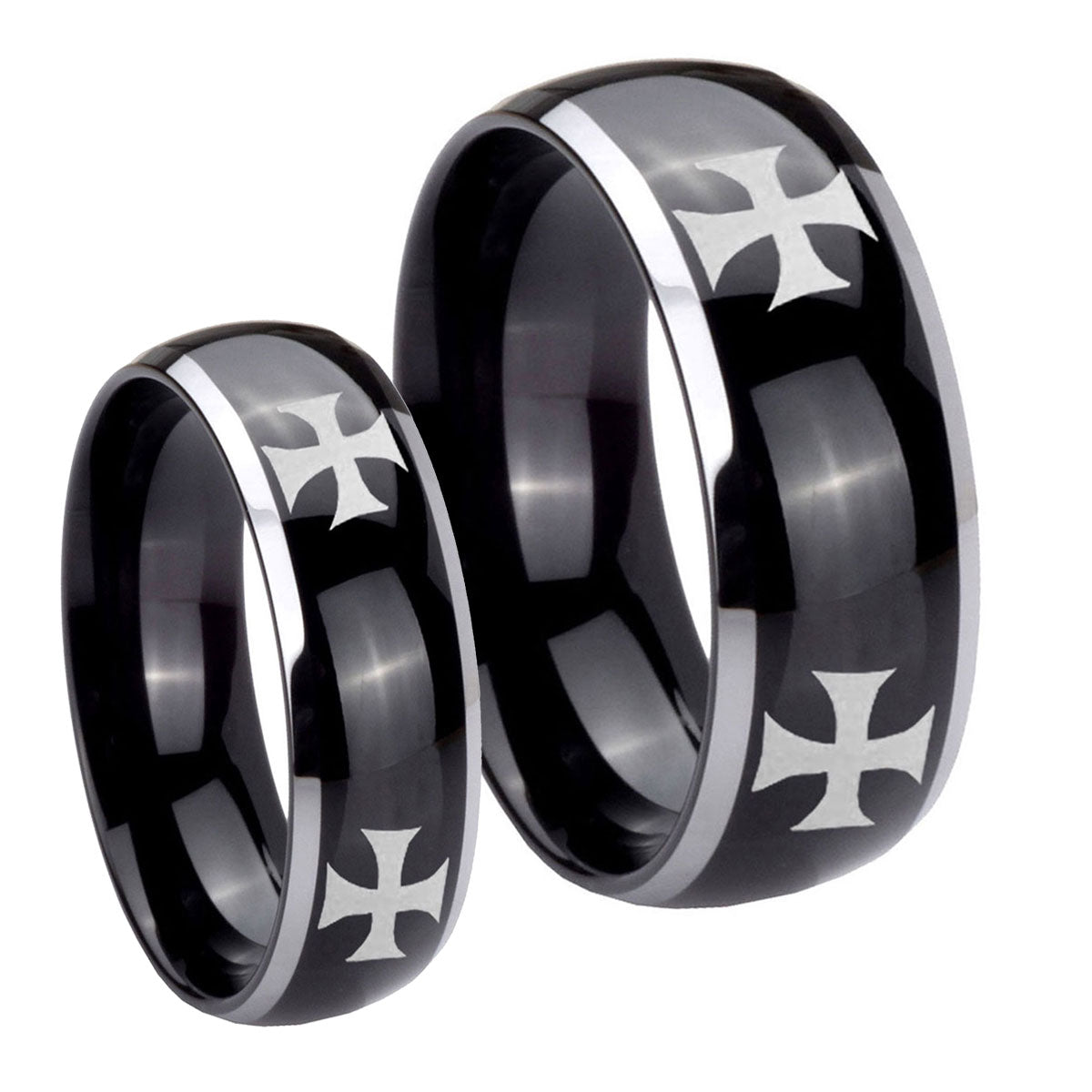 His Hers 4 Maltese Cross Dome Glossy Black 2 Tone Tungsten Men's Ring Set