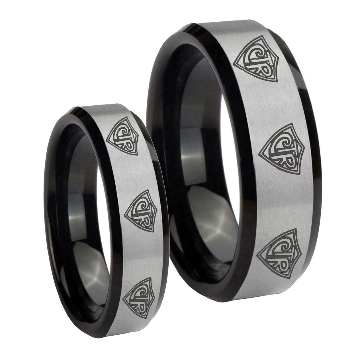 His Hers Multiple CTR Beveled Brush Black 2 Tone Tungsten Men Rings Set