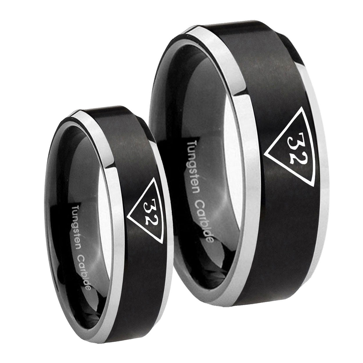 His Hers Masonic 32 Triangle Freemason Beveled Edges Brush Black 2 Tone Tungsten Engagement Ring Set