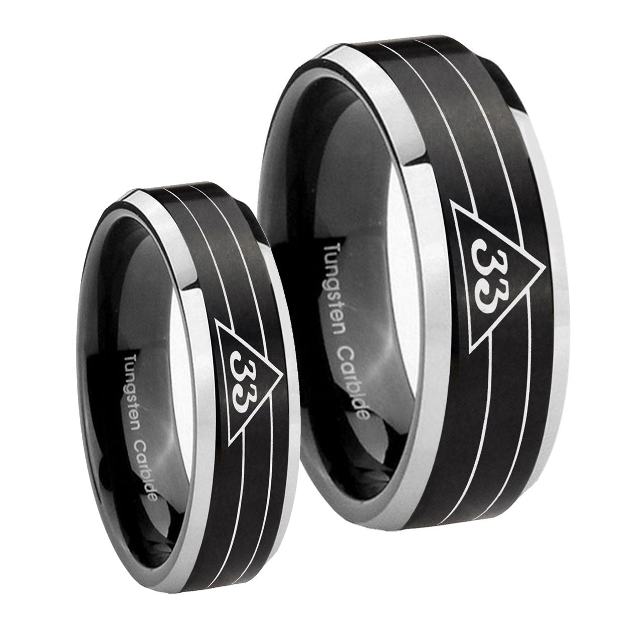 His Hers Masonic 32 Duo Line Freemason Beveled Edges Brush Black 2 Tone Tungsten Engagement Ring Set