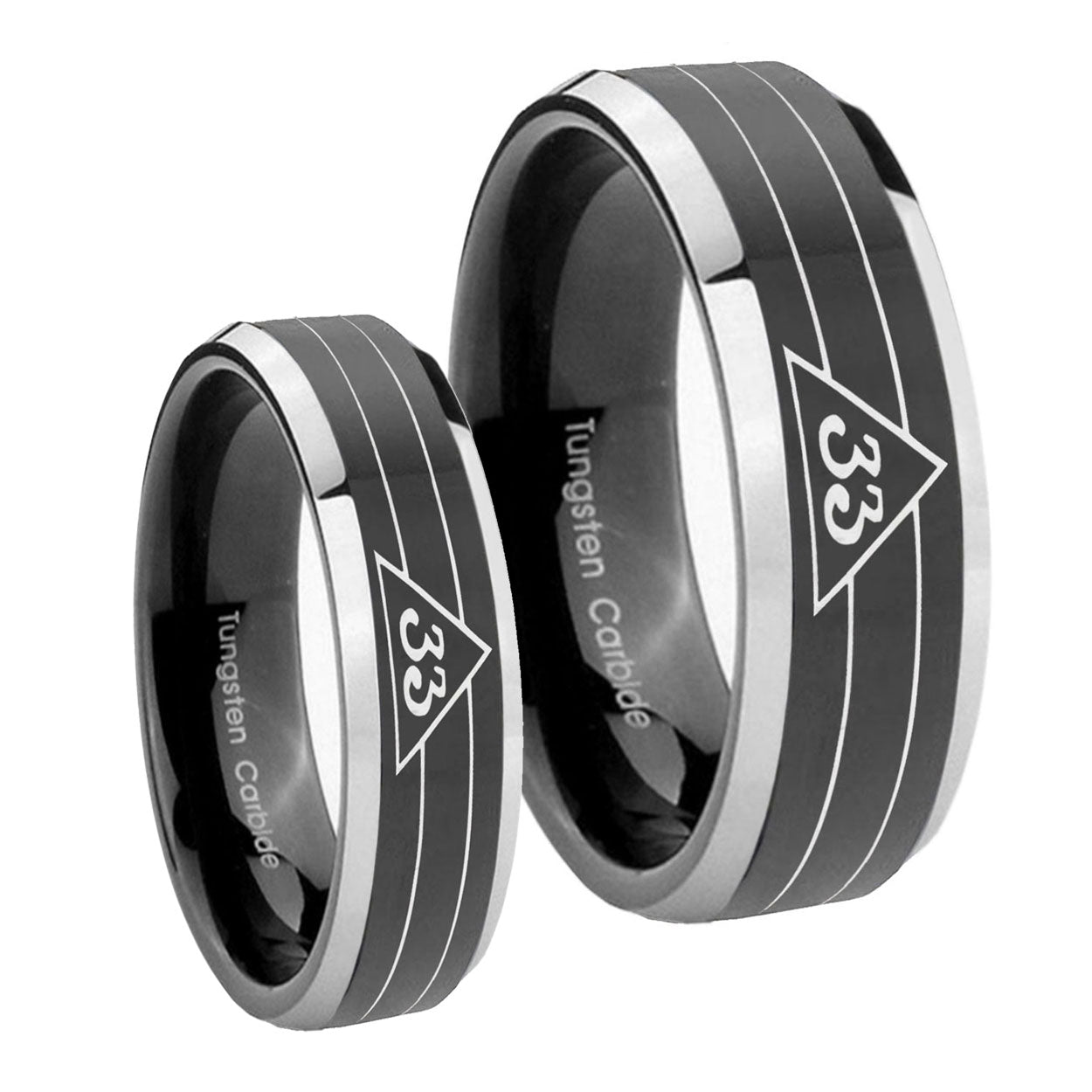 His Hers Masonic 32 Duo Line Freemason Beveled Glossy Black 2 Tone Tungsten Men's Promise Rings Set