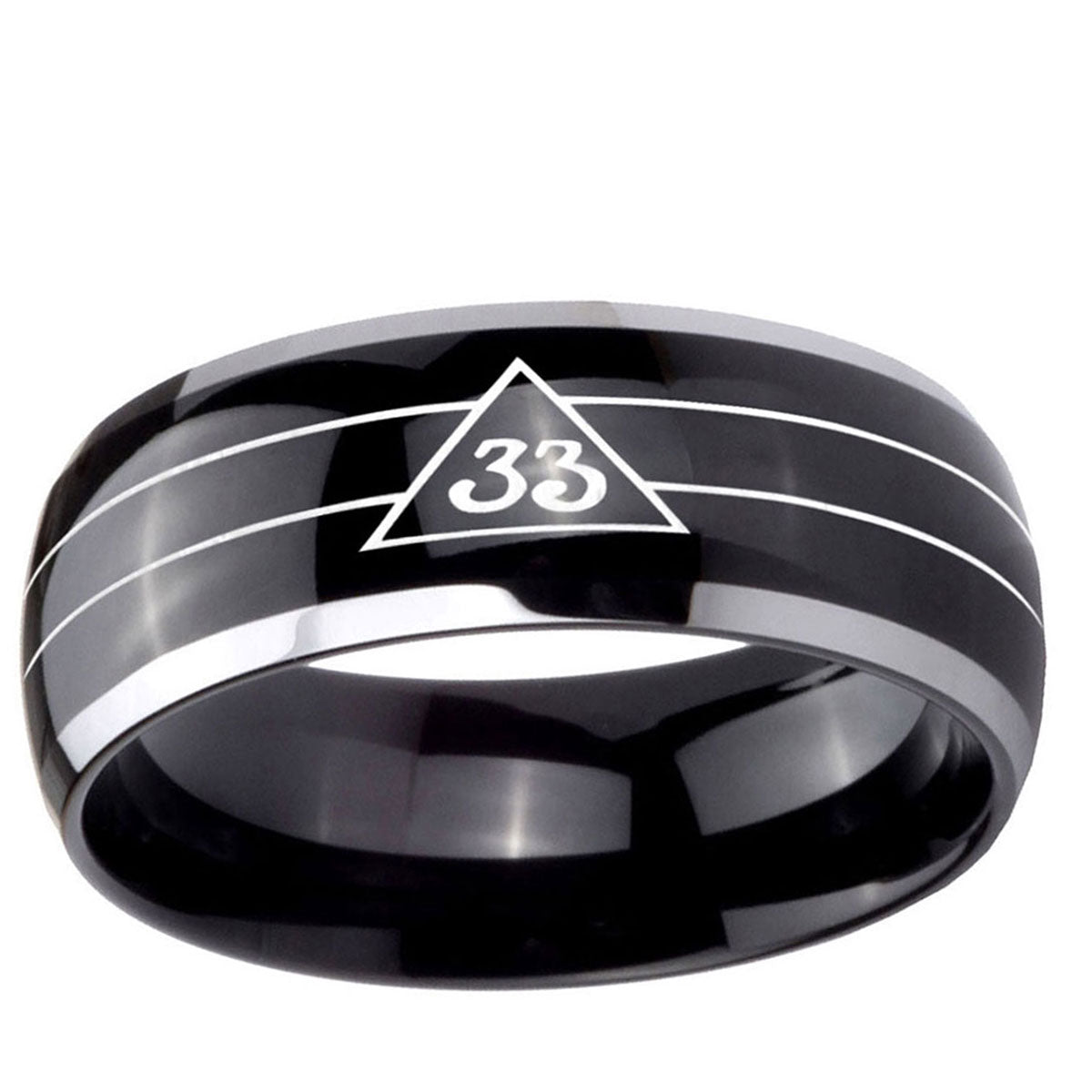 10mm Masonic 32 Duo Line Freemason Dome Glossy Black 2 Tone Tungsten Carbide Men's Promise Rings