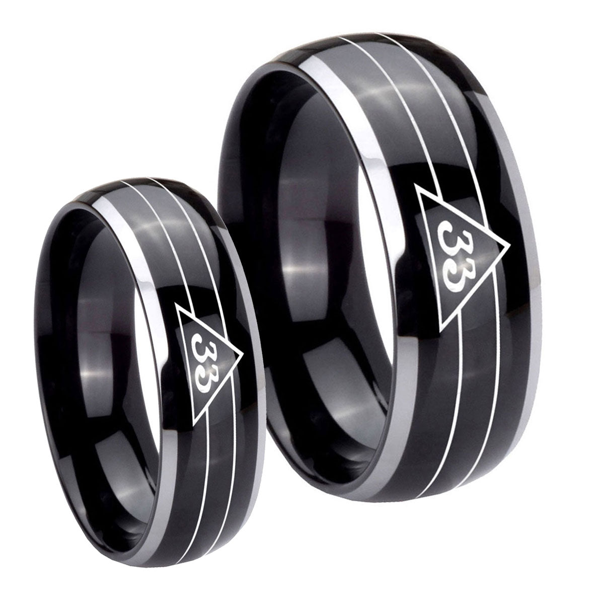 His and Hers Masonic 32 Duo Line Freemason Dome Glossy Black 2 Tone Tungsten Mens Promise Ring Set