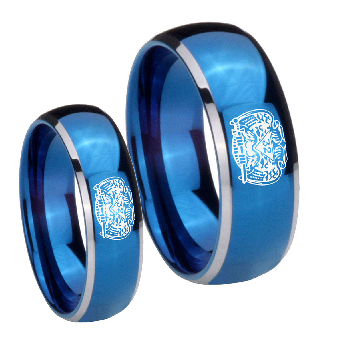 Bride and Groom Masonic 32 Degree Freemason Dome Blue 2 Tone Tungsten Carbide Promise Ring Set