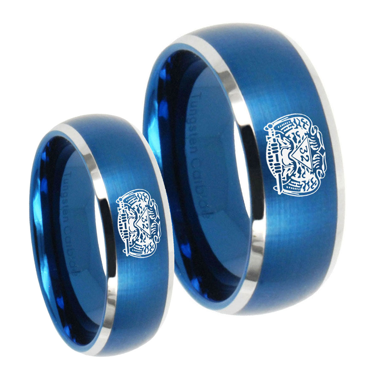 His and Hers Masonic 32 Degree Freemason Dome Brushed Blue 2 Tone Tungsten Anniversary Ring Set