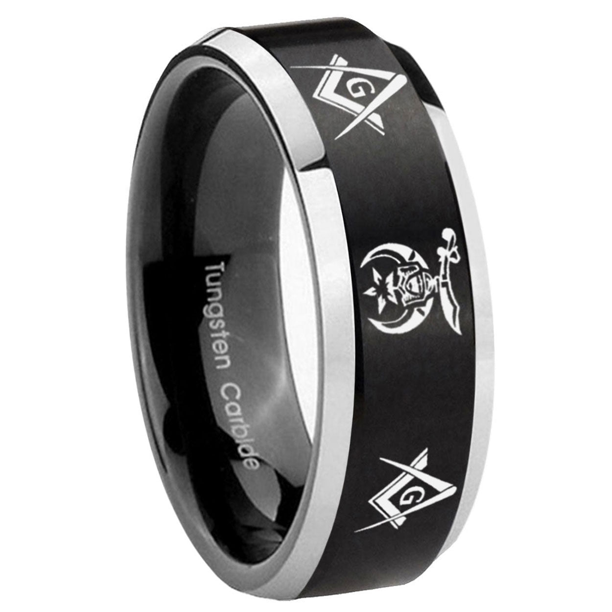 Buy the His And Hers Masonic Shriners Beveled Glossy Black Tungsten Engraved Ring. Sleek design.