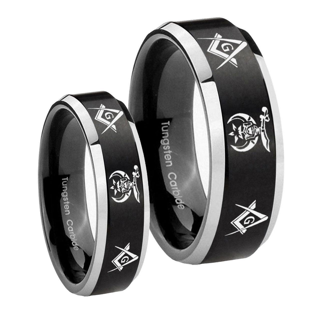 His Hers Masonic Shriners Beveled Brush Black 2 Tone Tungsten Wedding Ring Set