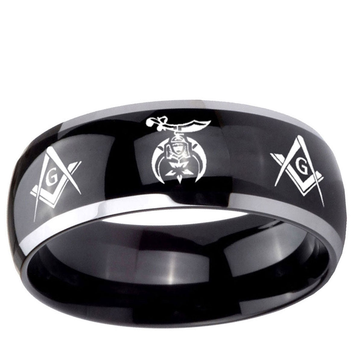 Celebrate with the 10mm Masonic Shriners Dome Glossy Black 2 Tone Tungsten Carbide Mens Bands Ring. This glossy black and 2-tone dome ring with Masonic Shriners design is perfect for weddings.