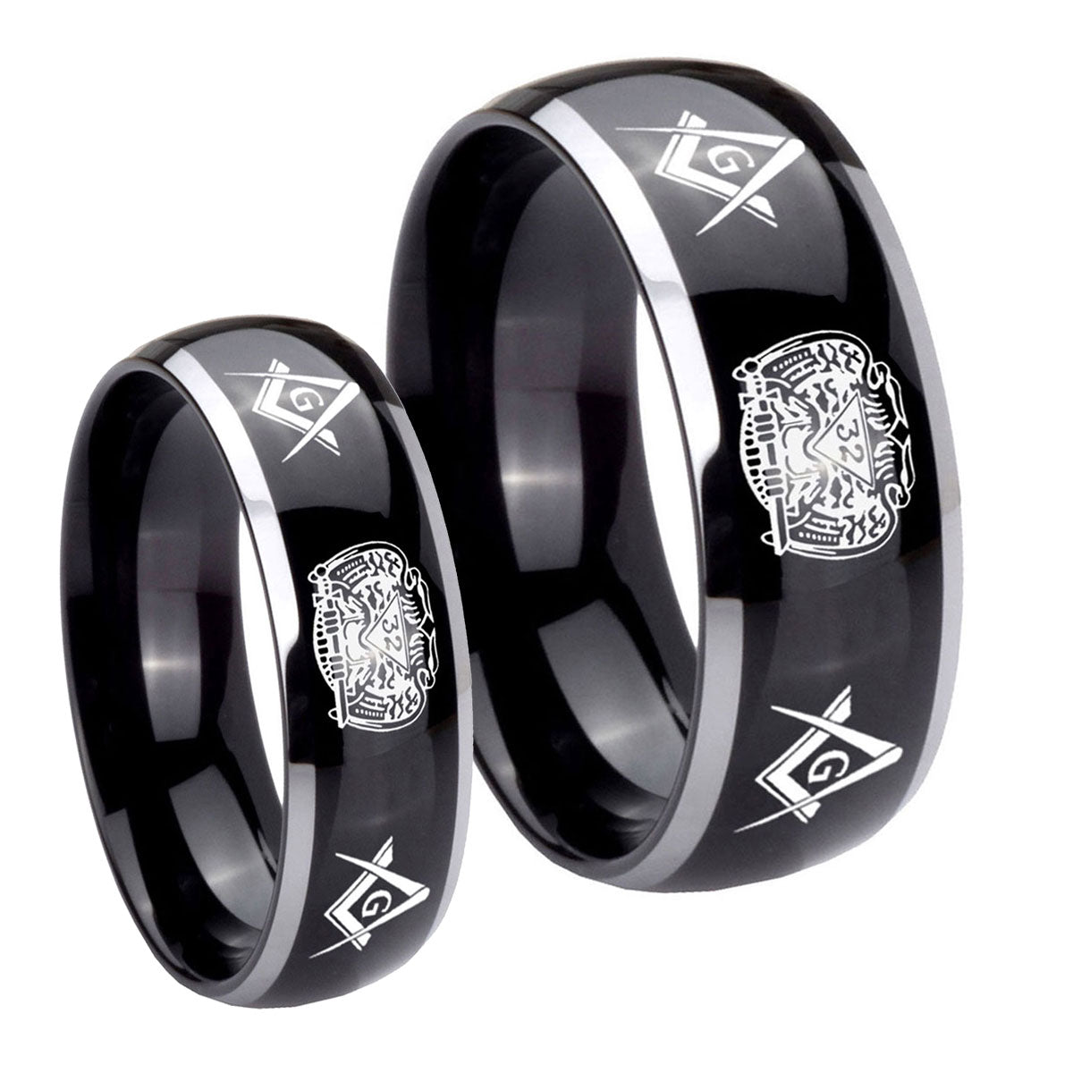 His Hers Masonic 32 Design Dome Glossy Black 2 Tone Tungsten Rings for Men Set