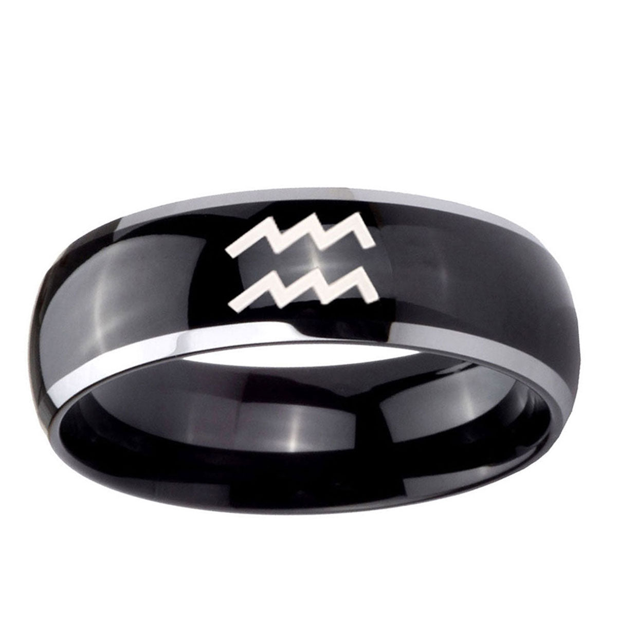 10mm Aquarius Horoscope Dome Glossy Black 2 Tone Tungsten Mens Anniversary Ring
