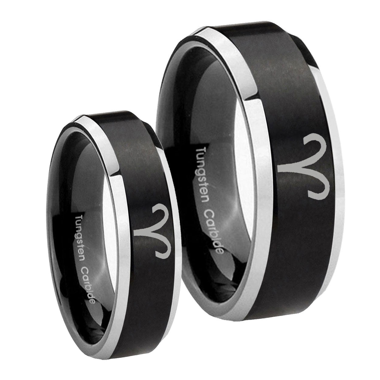 His Hers Aries Zodiac Beveled Edges Brush Black 2 Tone Tungsten Engraved Ring Set