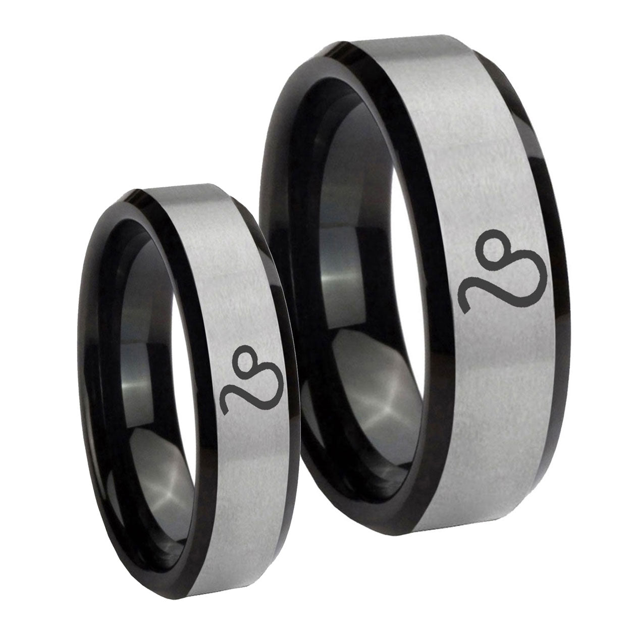 His Hers Leo Zodiac Beveled Brush Black 2 Tone Tungsten Personalized Ring Set
