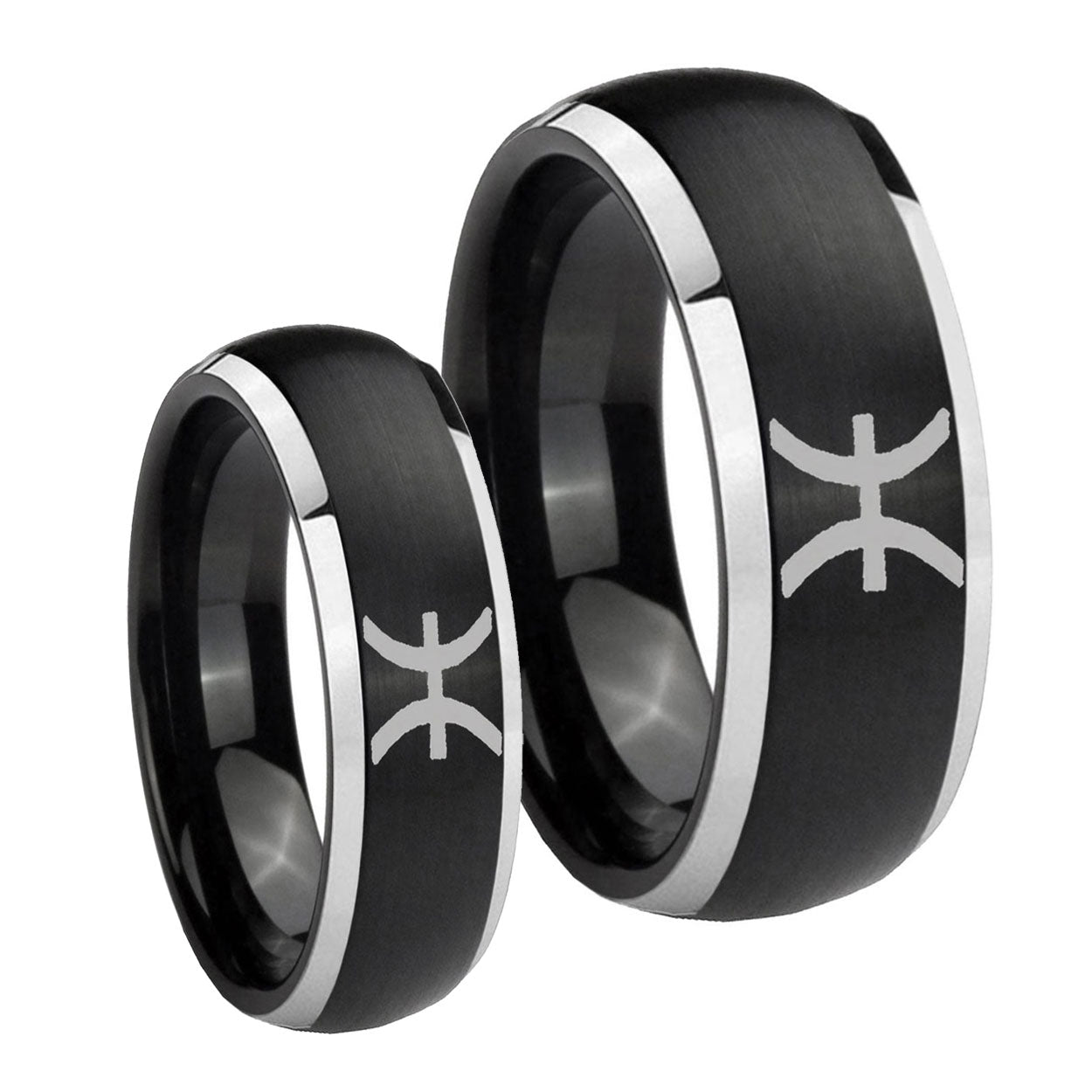 His Hers Pisces Zodiac Dome Brushed Black 2 Tone Tungsten Mens Ring Set