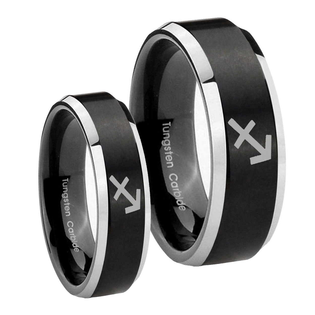 His Hers Sagittarius Zodiac Beveled Brush Black 2 Tone Tungsten Mens Ring Set