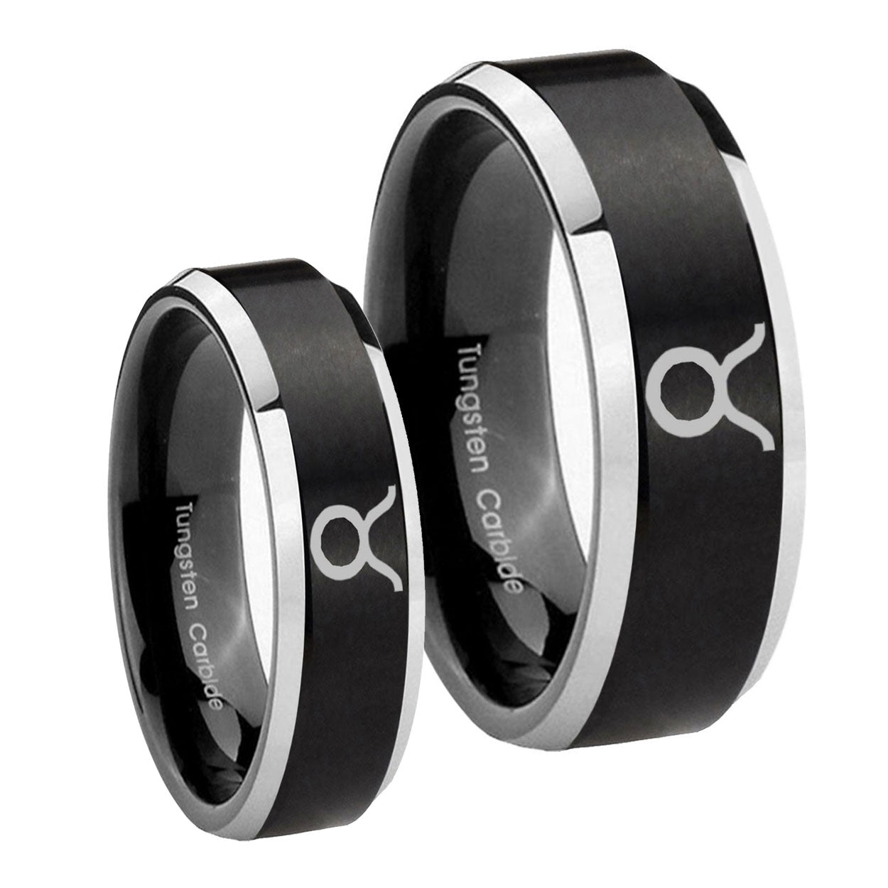 His Hers Taurus Horoscope Beveled Brush Black 2 Tone Tungsten Mens Ring Set