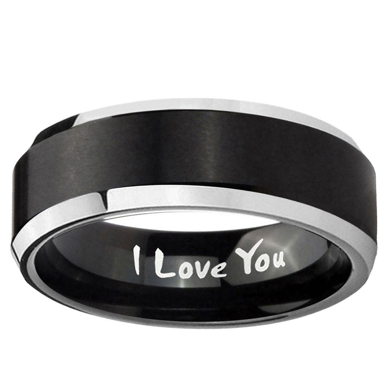 10mm I Love You Beveled Brush Black 2 Tone Tungsten Wedding Engagement Ring