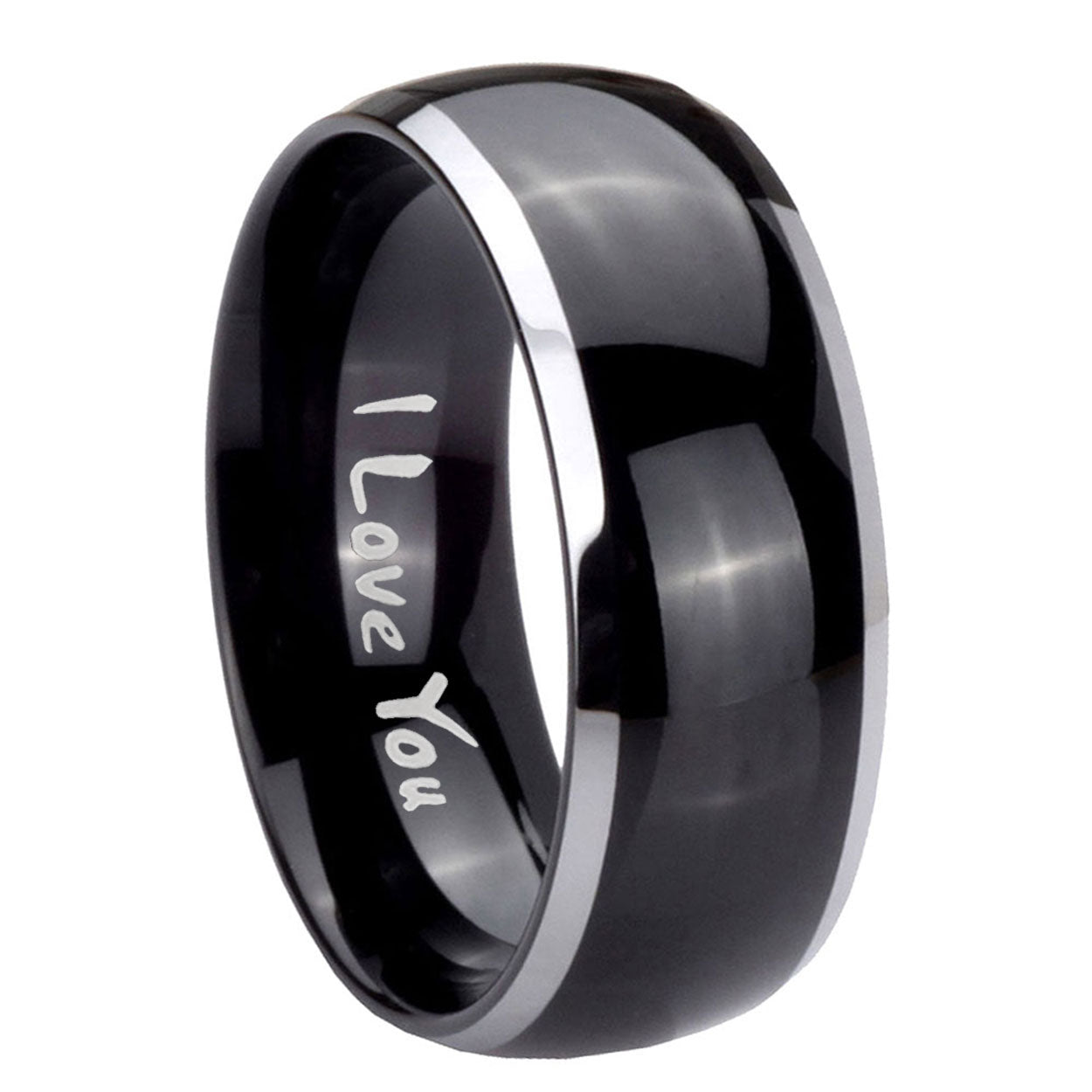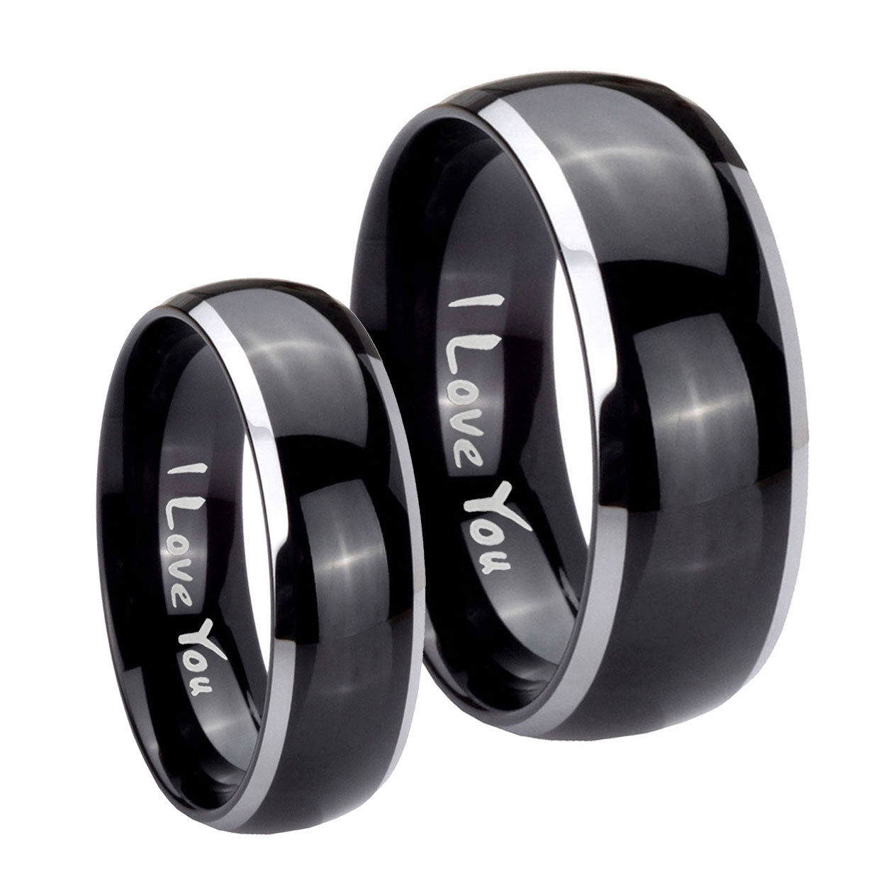 His Hers I Love You Dome Glossy Black 2 Tone Tungsten Men's Wedding Ring Set