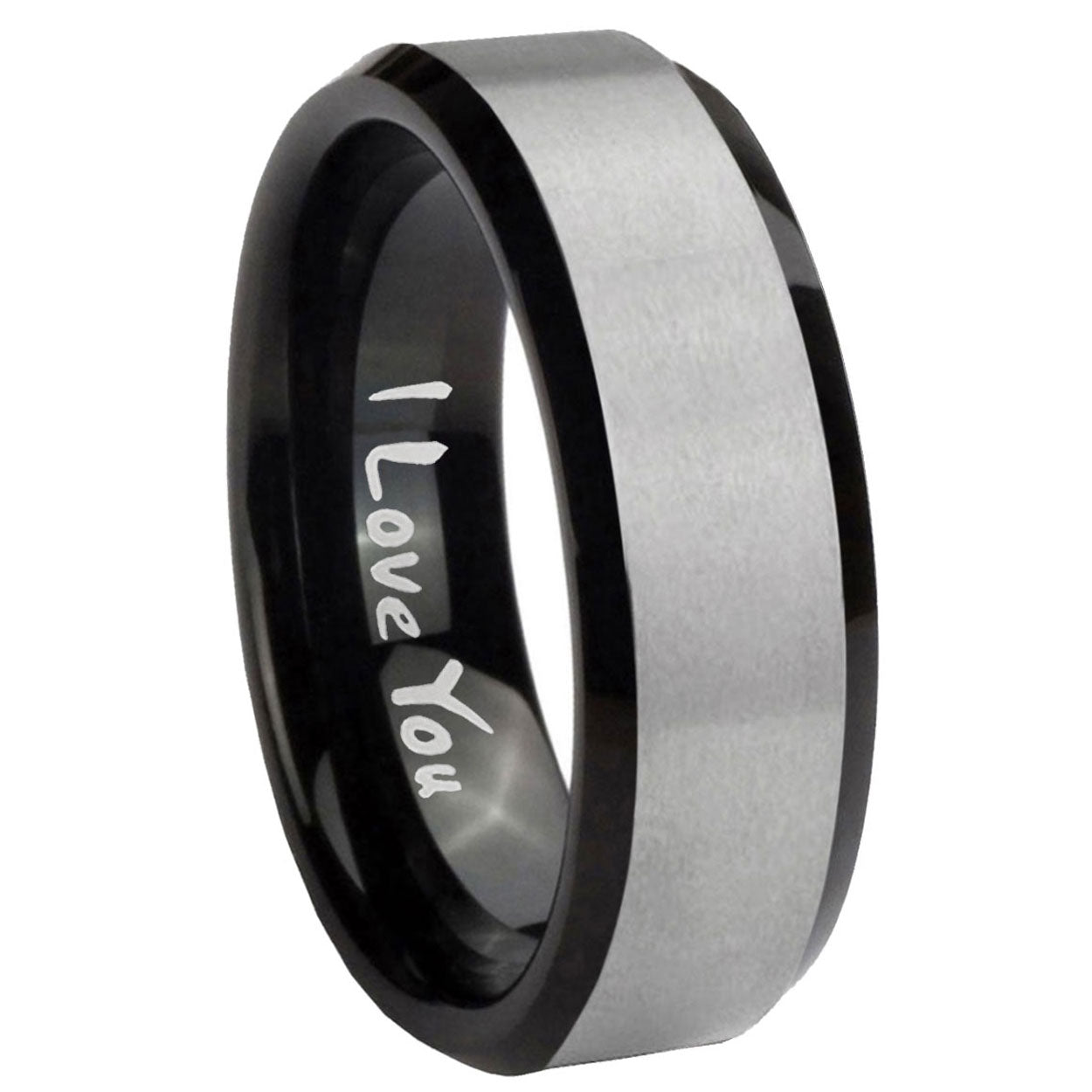 Intruding 5, 8mm I Love You Beveled Edges Brush Black 2 Tone Tungsten Men's Wedding Ring . Offer in both 5mm and 8mm band width brush black 2 tone finished from size 4 to 14