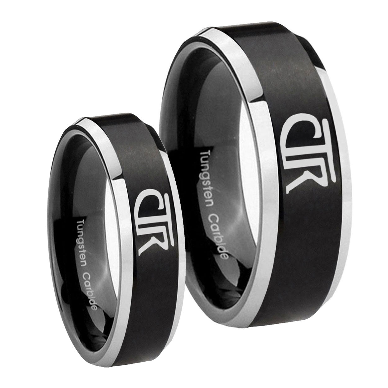 His Hers CTR Beveled Edges Brush Black 2 Tone Tungsten Men's Wedding Ring Set