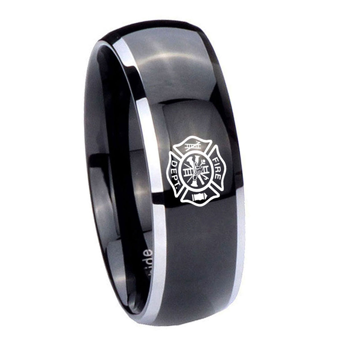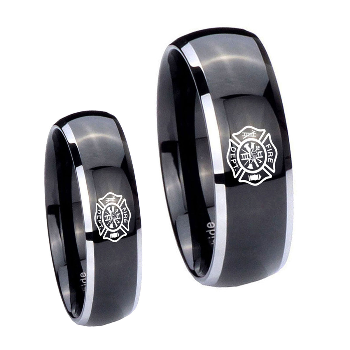 His and Hers Fire Department Dome Glossy Black 2 Tone Tungsten Mens Ring Set