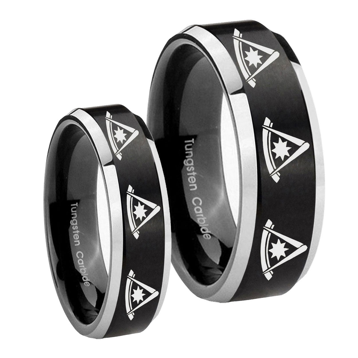 His Hers Multiple Pester Master Masonic Beveled Brush Black 2 Tone Tungsten Men Ring Set
