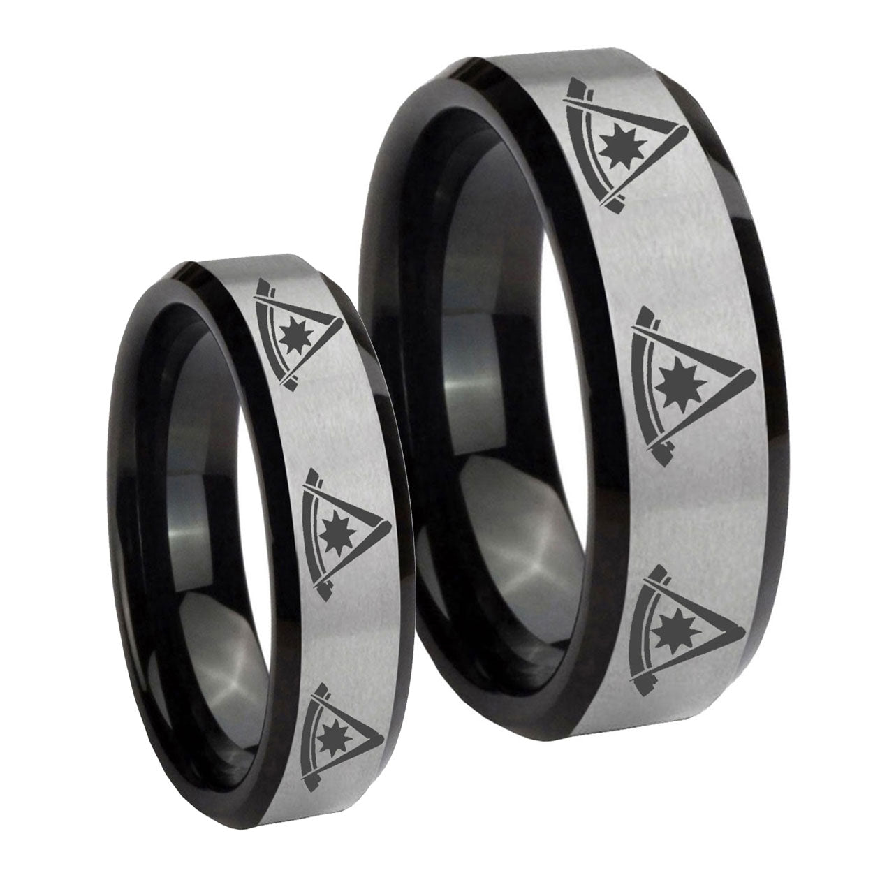 His Hers Multiple Pester Master Masonic Beveled Brush Black 2 Tone Tungsten Men's Ring Set